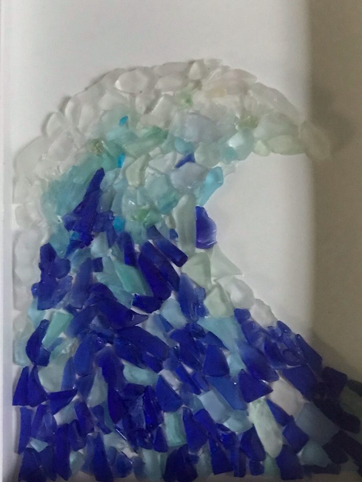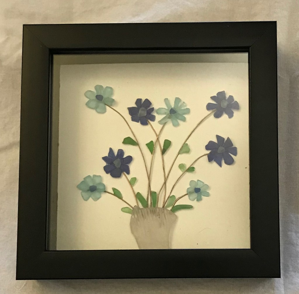 Blue Potted Flowers in a 6×6 shadow box, made with recycled glass $40